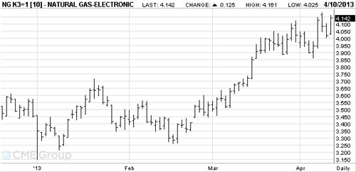 Index Priced Gas is gas bought at market prices. The price is based on an index (like the graph below of the NYMEX index for May 2013 natural gas futures) with a markup or “basis” over and above the index to cover the balance of the costs to get the gas delivered as shown in the pie chart above. This method poses the most risk for buyers since it is subject to market swings based on weather, price speculation, etc. Most LDC’s standard approved rates include a market based price option.
